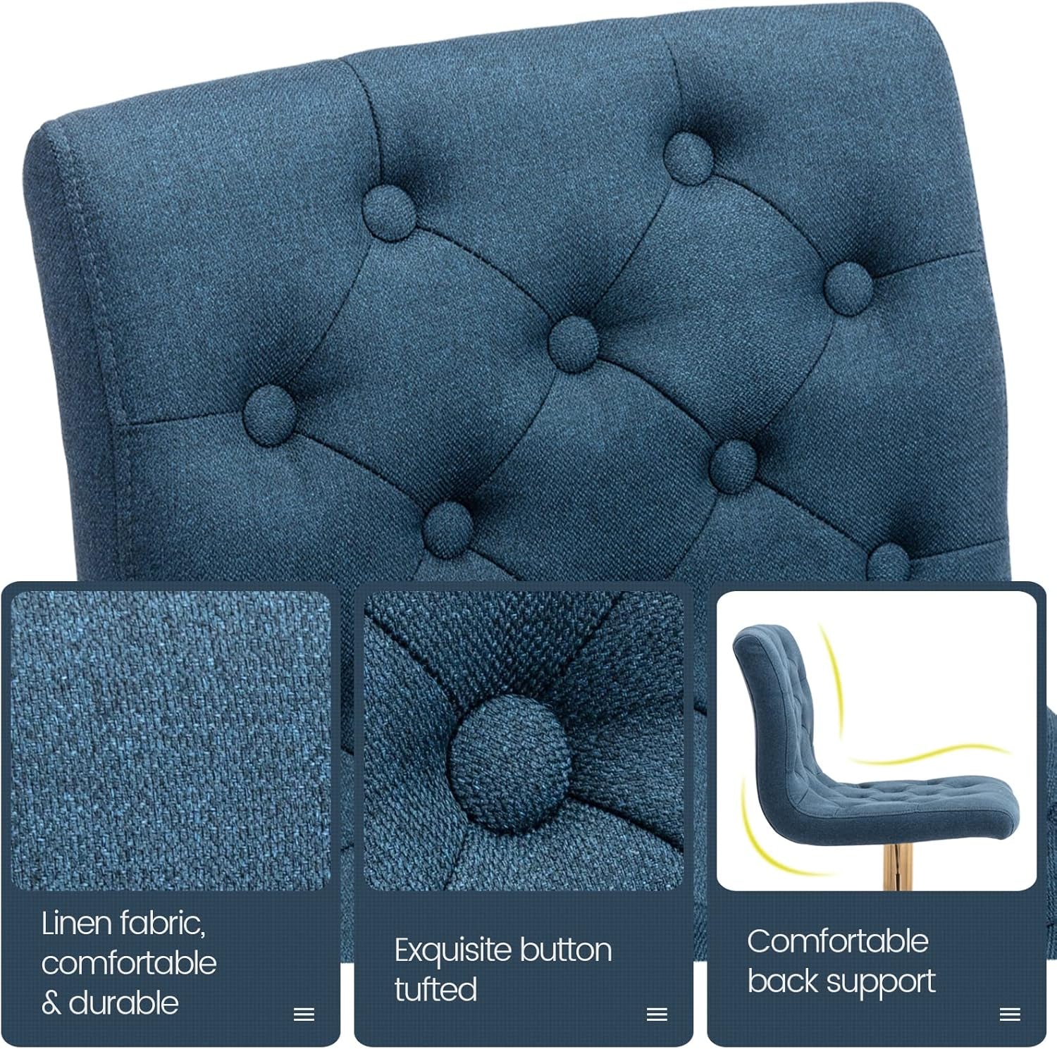 Tufted Fabric Bar Stools Set of 2, Adjustable Swivel Counter Height Barstools with Back, Upholstered Armless Airlift Bar Chairs for Kitchen Dining Cafe (Blue, Gold Base)